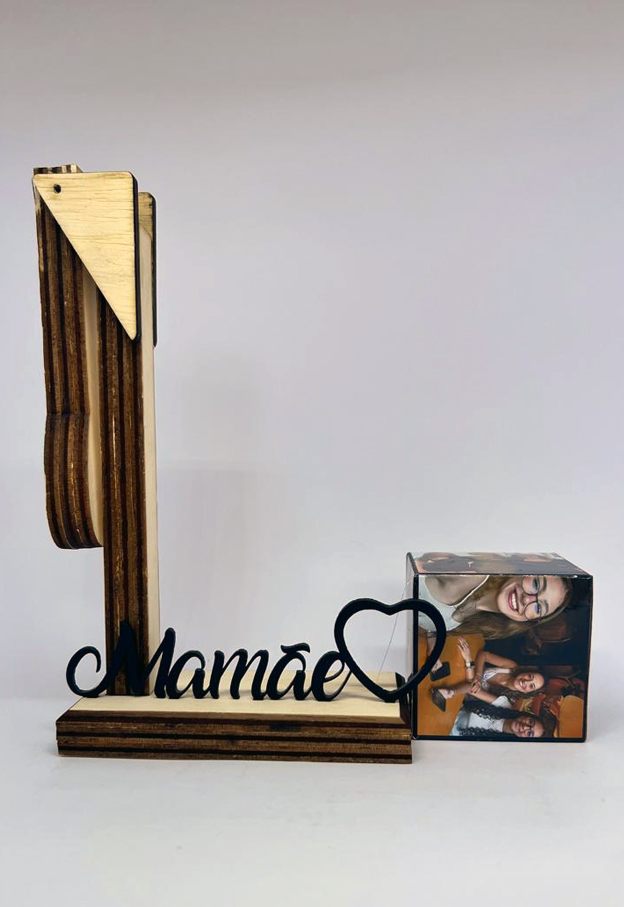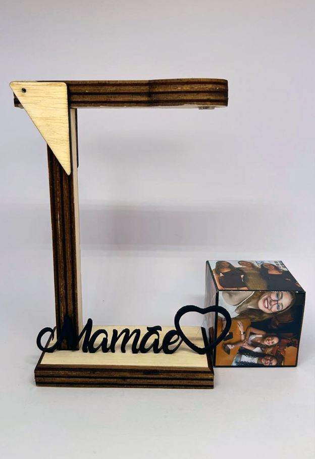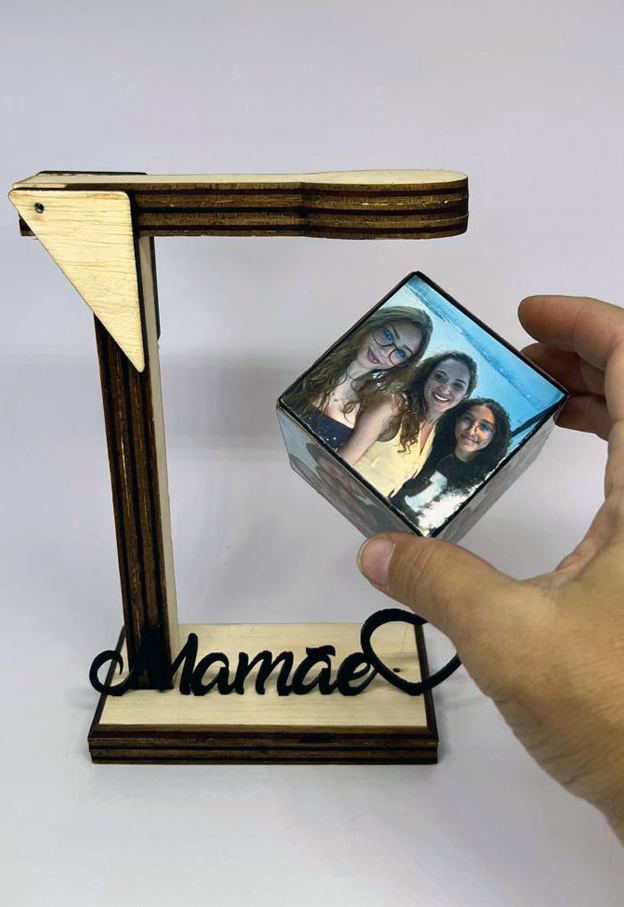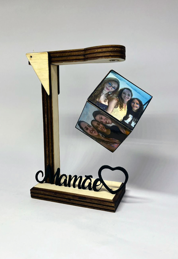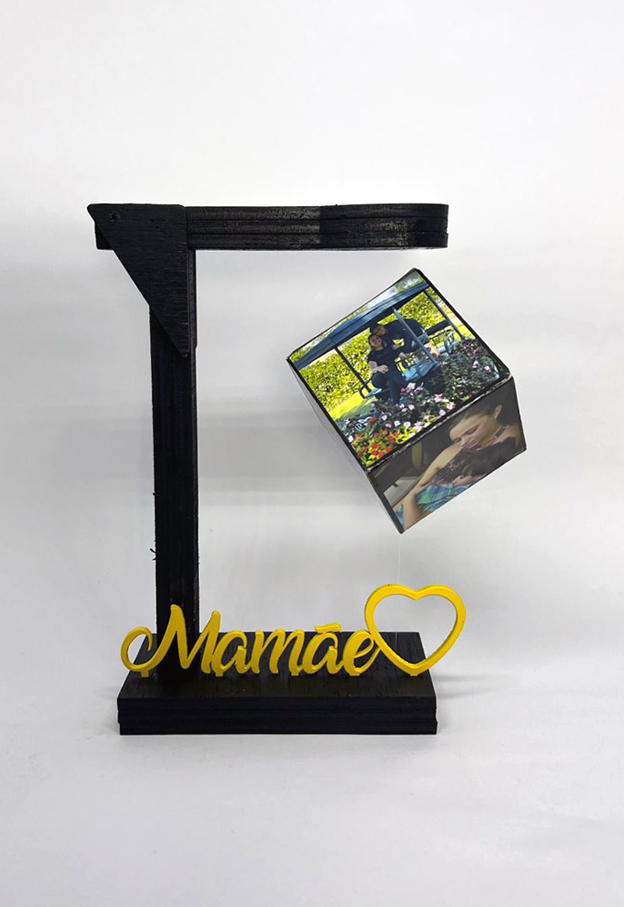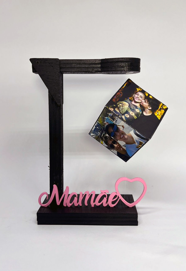 Presente para a Mamãe! Surpreendente porta fotos! Suporte com cubo suspenso! Inove com esse presente que une o estilo rústico na cor natural, ao estilo futurista (magnetismo), também vendido na cor preta, faça sua escolha! Impressão fotográfica em alta resolução. Suspensão por magnetismo. Personalize com a palavra Mamãe ou Mãe.